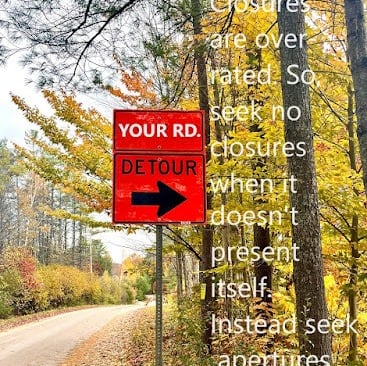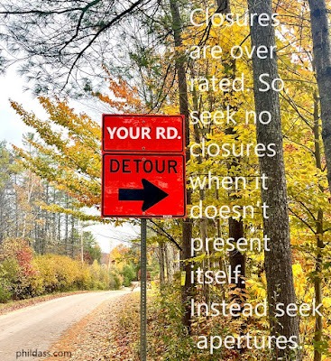 All my life I have been misled by a 'closure' idea behind everything, I have realized that it's better to let sleeping dogs lie, in this case, why seek closure at all. Let some things remain as they are. Open. It is a psychology you have to adapt to. That's why this.